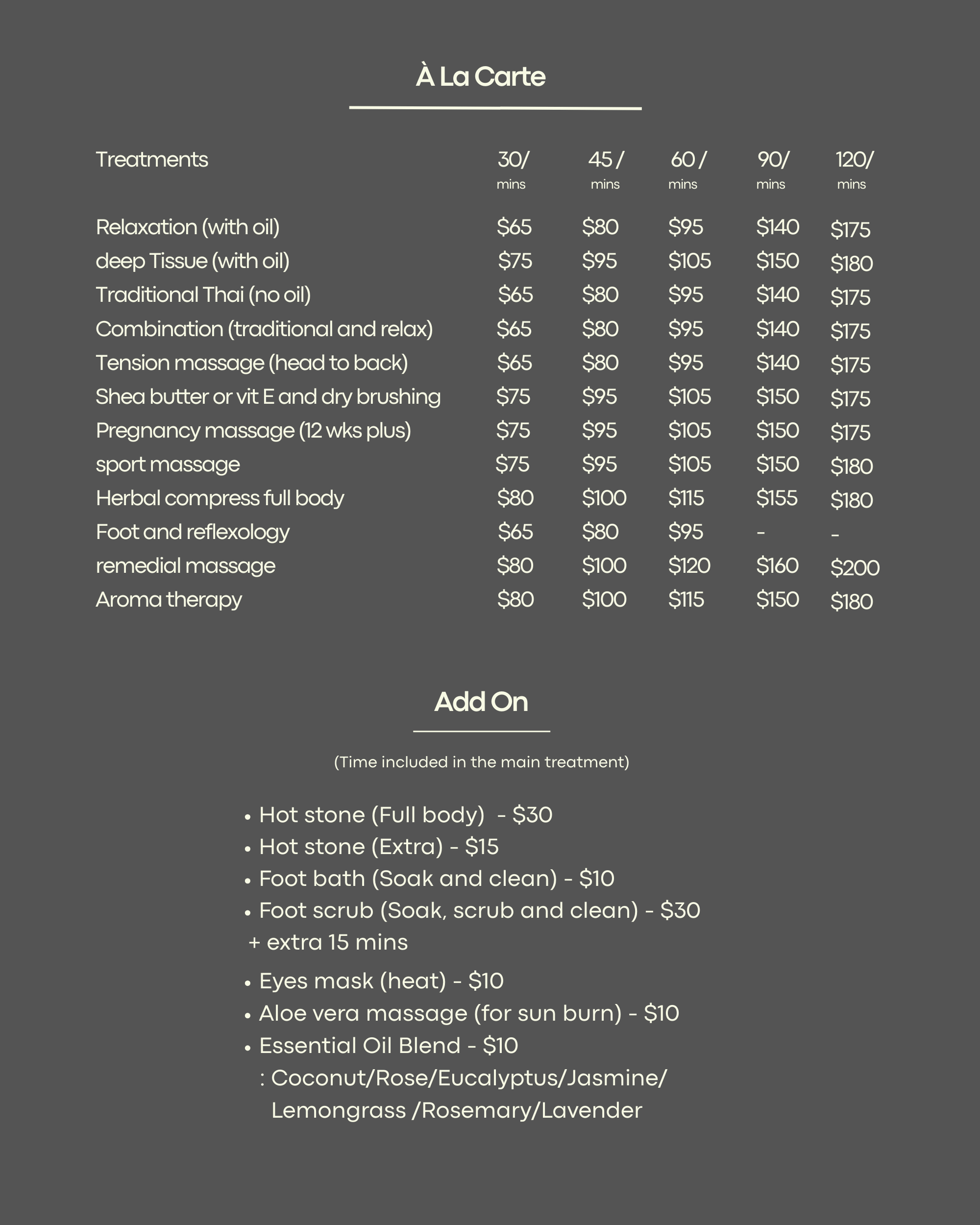 Thai stretching, rhythmic oil massage and aromatherapy with eyes mask and essential oil blend.